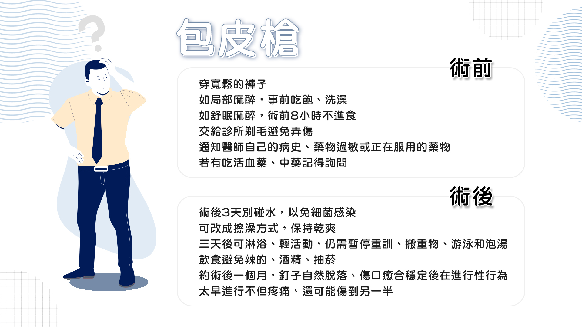 | 包皮槍手術 | 快速、傷口整齊、疼痛感低、恢復快 | 需專業醫師操作、設備費用較高 |