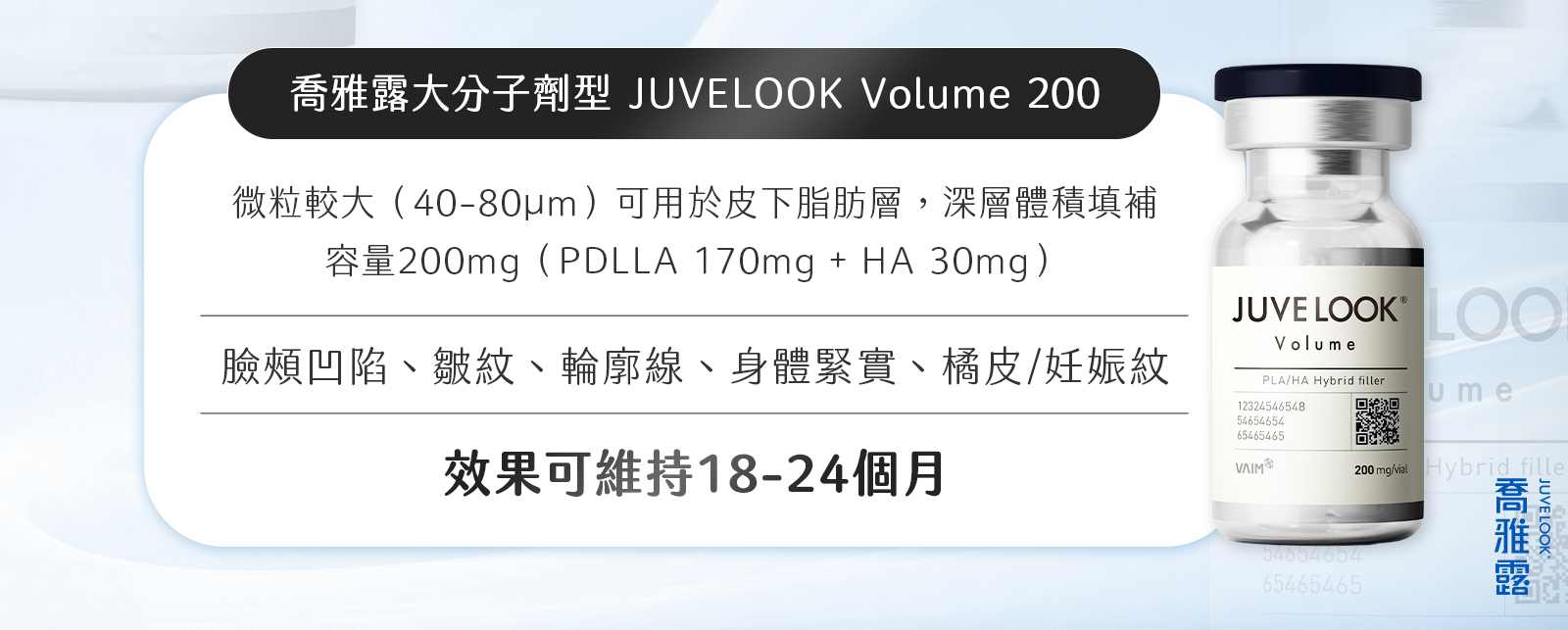 -JUVELOOK Volume 200mg 的微粒較大,適合深層體積的支撐與填補,針對輪廓線、皮膚鬆弛、夫妻宮凹陷、深層皺紋、法令紋以及其他較為嚴重的老化跡象,可提供顯著的膠原增生。喬雅露大分子劑型施打後可維持18-24個月,讓肌膚重拾緊緻澎潤與彈力,自信閃耀每一刻。