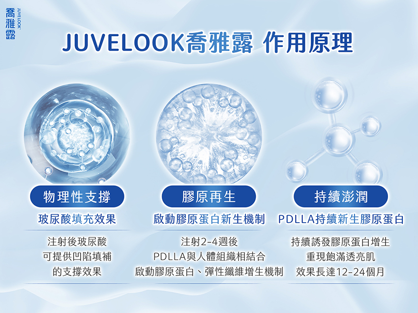 JUVELOOK喬雅露以聚雙旋乳酸(PDLLA)× 玻尿酸(HA) 雙效配方,不只是支撐效果,更啟動自體新生膠原蛋白機制,為肌膚注入青春能量!